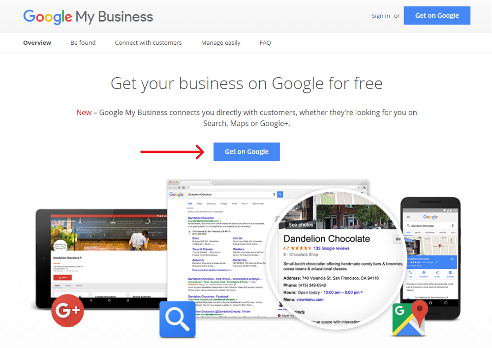 - Google My Business ünvanına daxil olun və yuxarı sağ hissədə yerləşən “Get on Google” düyməsini klikləyin.